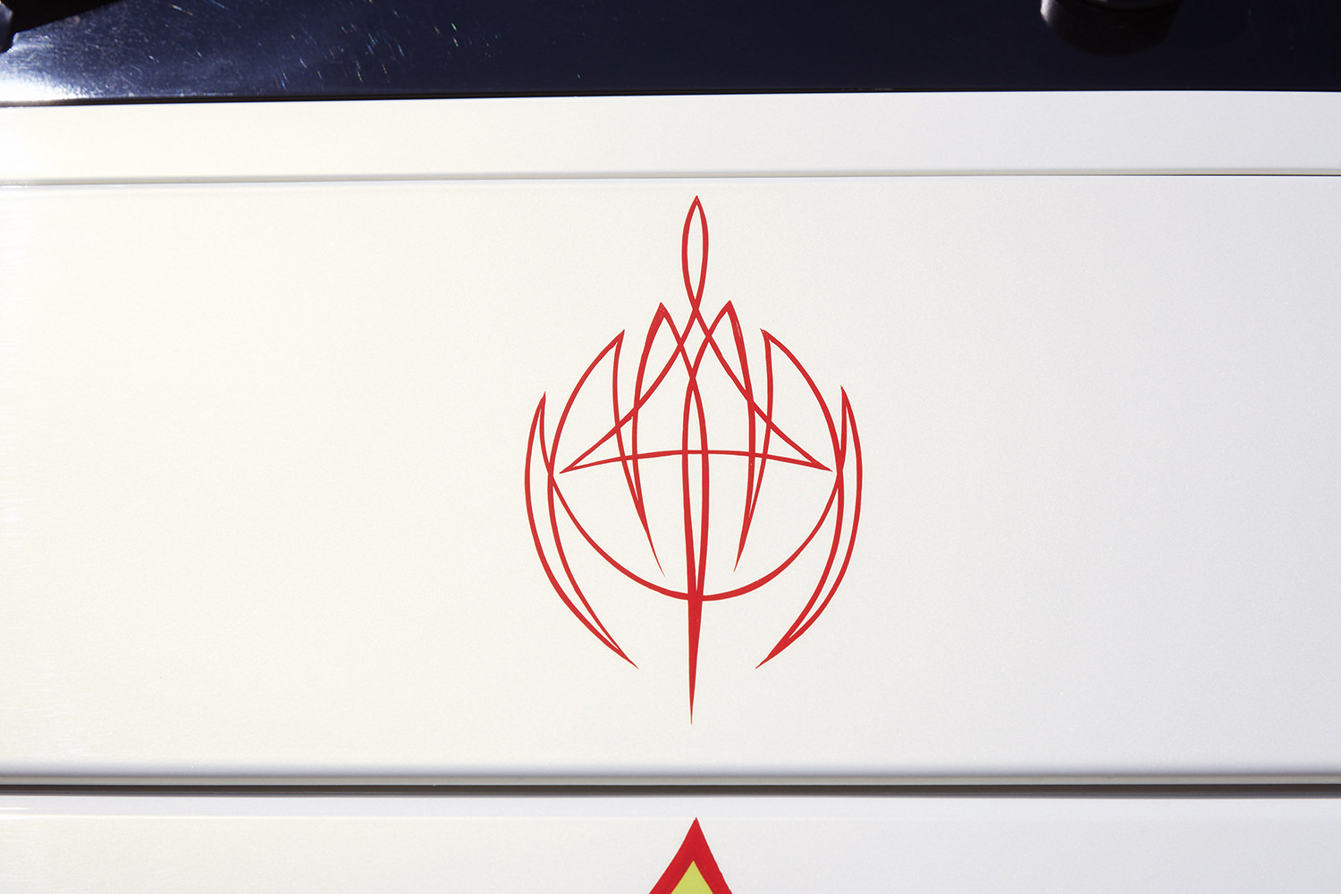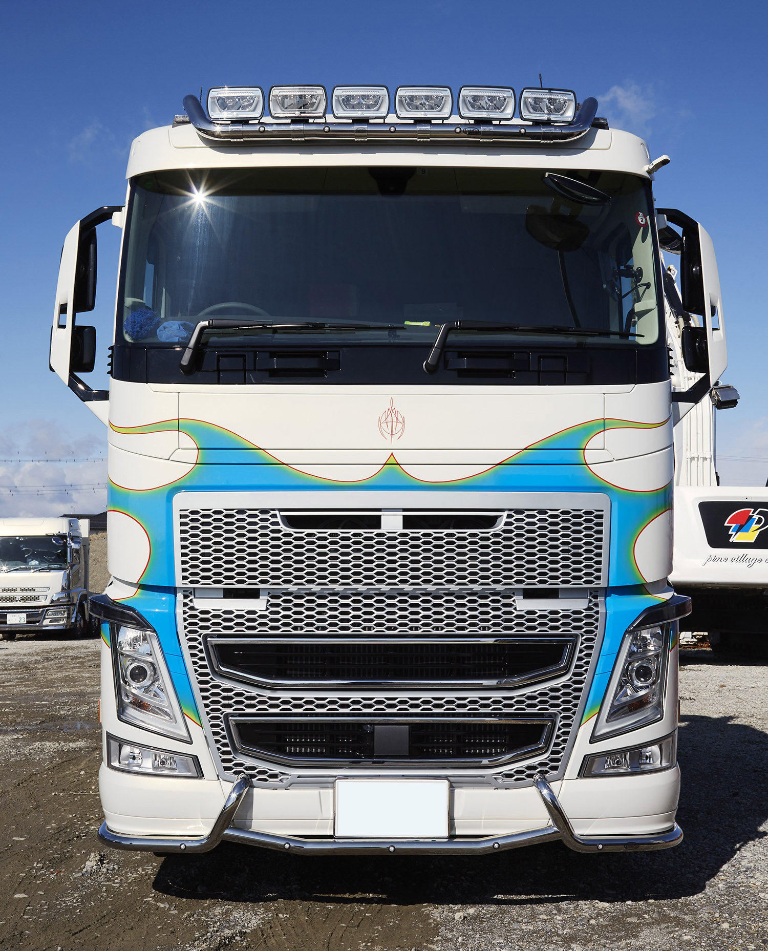 560馬力のボルボFH2デフ。ファストエレファントではおなじみのピンストライプ職人、ケン・ザ・フラットトップさんのファイヤーパターンが、その力強さをアピールしています。手書きの美しいラインが贅沢なアクセントになり、爽やかなカラーリングが西海岸を感じさせます。