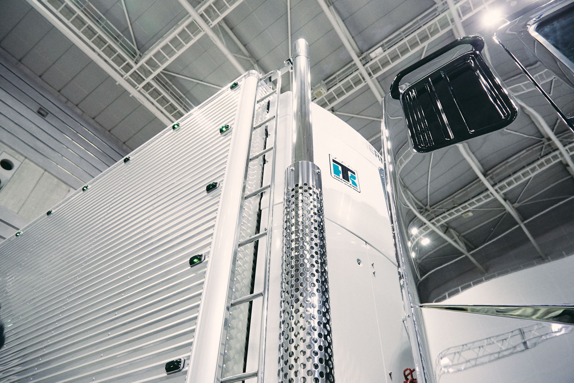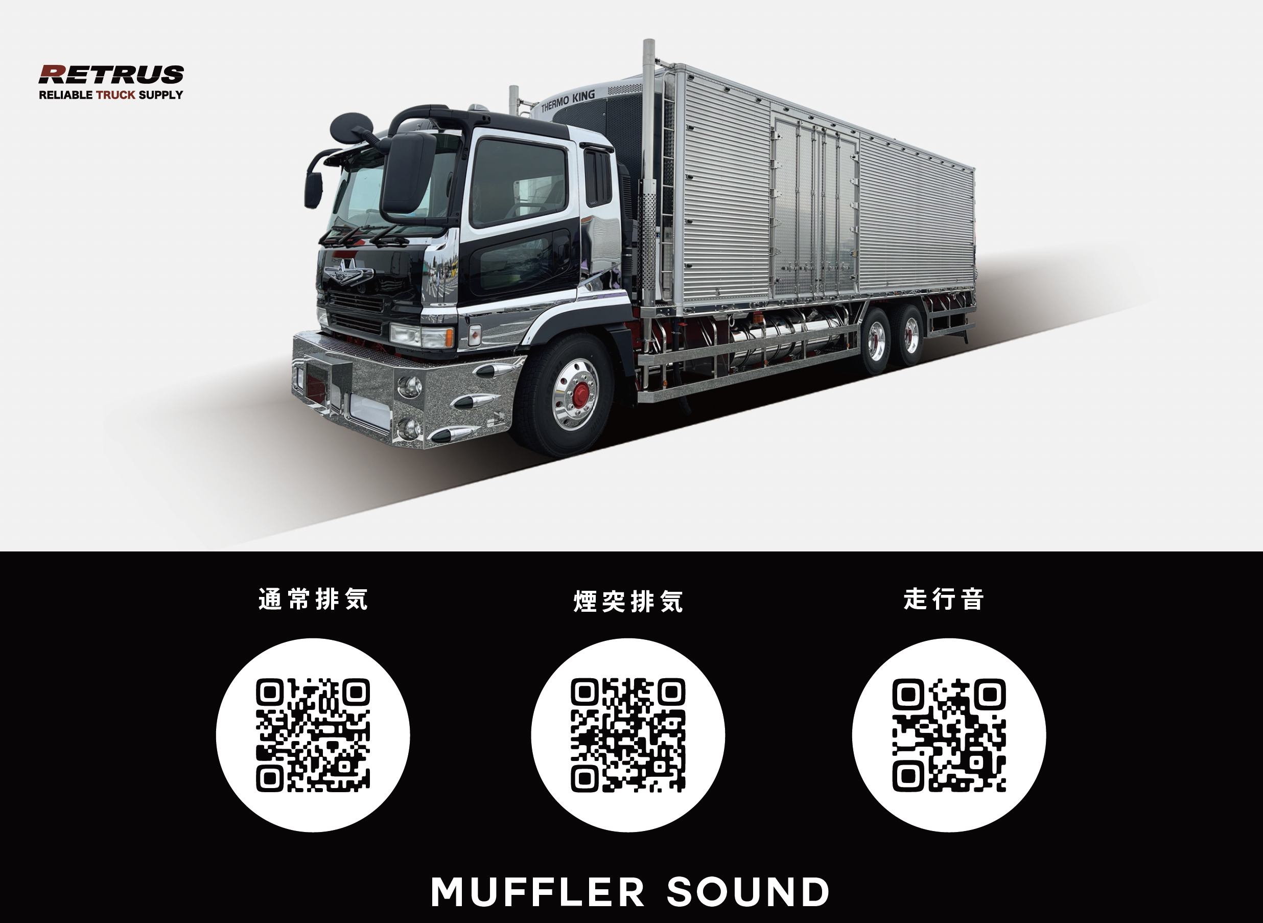 2004年式ふそうスーパーグレート冷凍バン。V8エンジン(8M21)搭載モデルで左シュノーケルが特徴(直6モデルは右シュノーケル)。定番のバスマーク行灯や硬派な舟型バンパー、鳴らせる煙突マフラーで飾りつけている。ウロコステンレスが特徴の造りボディはトランテックス製で、ボディ下部にまでウロコステンレスが張り巡らされている。