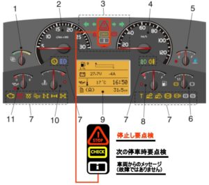 ・赤色の“STOP”マークは、エンジンやミッション、ブレーキなど、走行するのに重要な部位に重大な故障が発生し、運行を継続する事が難しい場合に点灯します。出来る限り安全な場所に移動して停止し、状況を連絡して下さい。