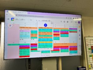 ・事務所内に大型モニターを設置し、Windows PCを接続してGoogleカレンダーを常時表示 (画面は2週間表示で当日だけフルに表示)