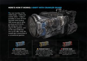 クローラー・ギアを備えたI-Shiftは、ボルボのFM、FMX、FH、およびFH16モデル全体で、13および16リッターエンジンのダイレクトドライブおよびオーバードライブモデルのトランスミッションにオプション設定されています。これは、このクローラー付きI-Shiftトランスミッションが、多くの異なるタイプの輸送セグメントに使用できることを意味します。(日本では導入されていないモデルが有ります)